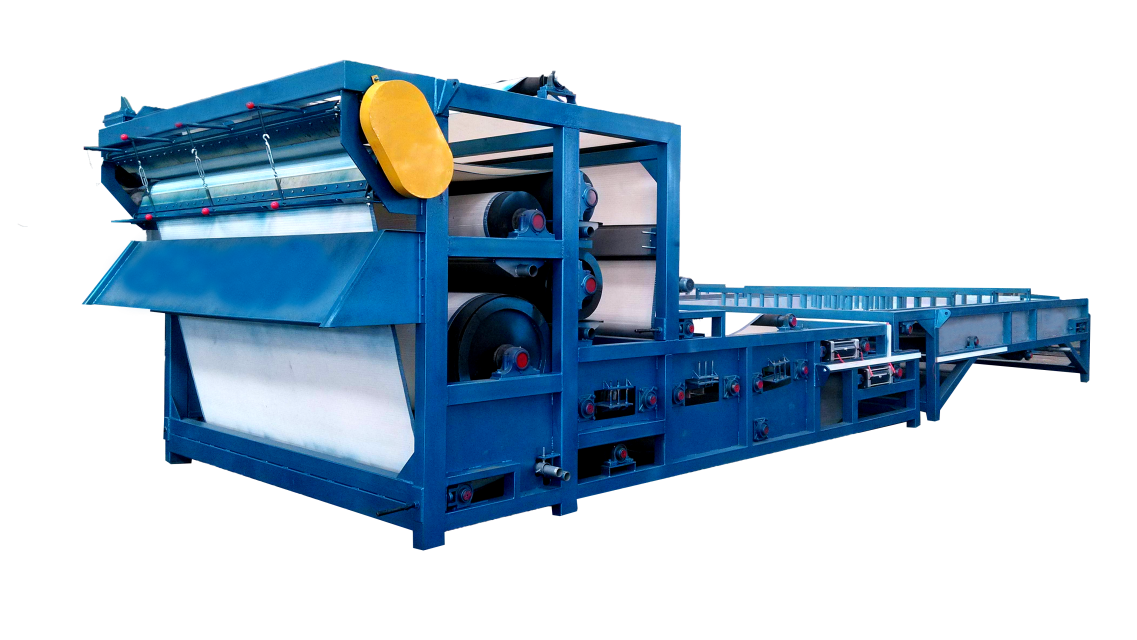 帶式壓濾泥漿脫水機是洛陽隆中重工在引進國外壓濾技術(shù)基礎(chǔ)上研制成功的新機型,該設(shè)備是通過兩條濾帶纏繞在一系列順序排列、大小不等的輥輪上,利用濾帶間的擠壓和剪切作用,來脫除料漿中水分的一種壓濾設(shè)備,具有著能連續(xù)作業(yè)、自動化程度高、節(jié)能、使用維護方便等優(yōu)點,是一種進行污泥脫水減量化處理的理想設(shè)備。